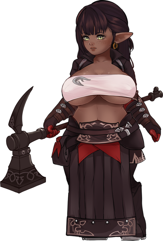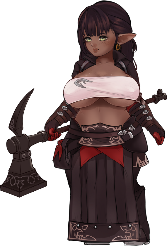 A headstrong individual who is stubborn when she believe she is doing the right thing. Often impatient and not one for much diplomacy, she prefers the iron of the forge to the silver of the tongue, and likewise has little respect for those who ply the latter. Unskilled in combat or fighting, she is far more suited in aiding the adventurers and denizens of the land with her skills.