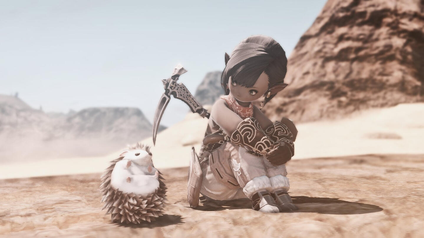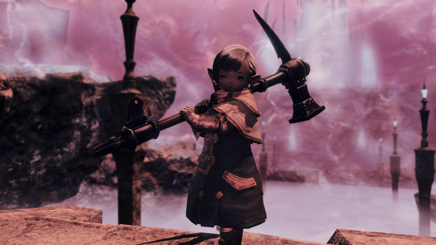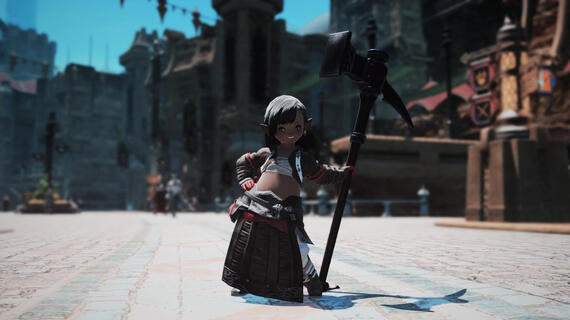 Humble blacksmith of Ul'dah who helps supply shops of the city and the Flames Grand Company with equipment. Born and raised in Ala Mhigo, Liz was taken in by adoptive Hyur parents, learning her trade from them as part of the family business. Upon the Garlean takeover of her home nation, she fled to the west, ending up in the jewel of the desert, Ul'dah.
